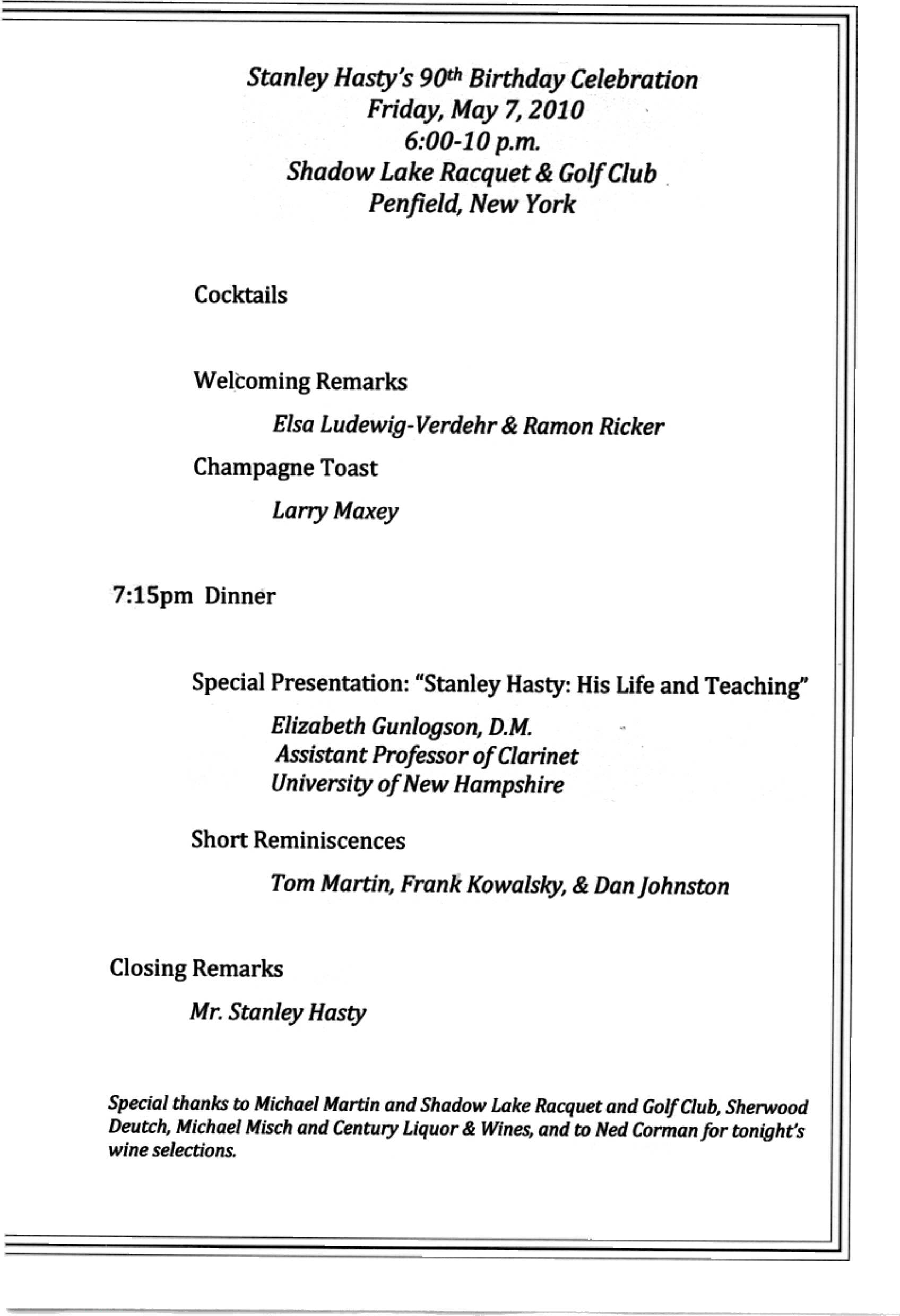 Stanley Hasty 90th Birthday Celebration held in his honor by Former Students and the Eastman School of Music held 7 May 2010 in Rochester, New York