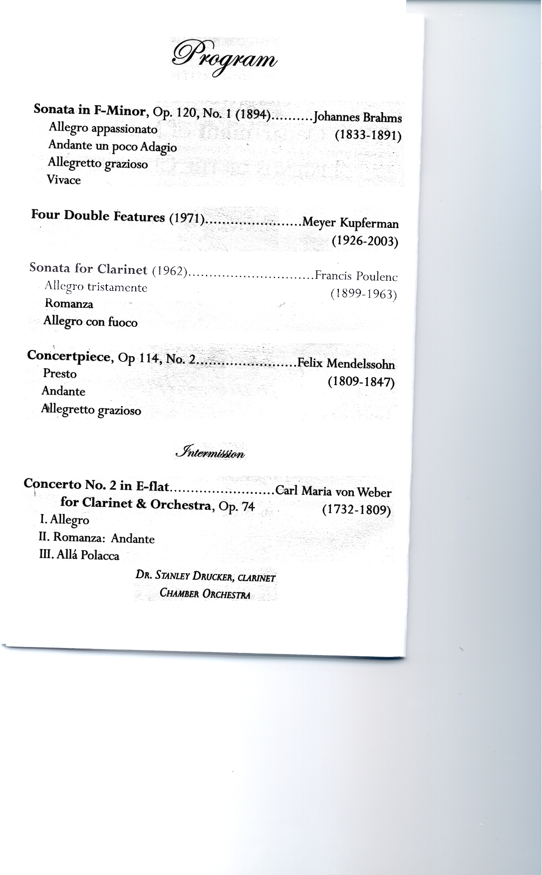 Like the final Concerto Drucker played with the New York Philharmonic last June (Copland Clarinet Concerto), this past 4 days has been a high point of the year for everyone who came and was involved. Professor Estrin, a longtime Orchestral colleague in the NY Phil with Dr Drucker and a former Juilliard student and a lineage teacher of his concepts, places Dr Drucker as a part of the University musical life. This week was an historic event for this School of Music.