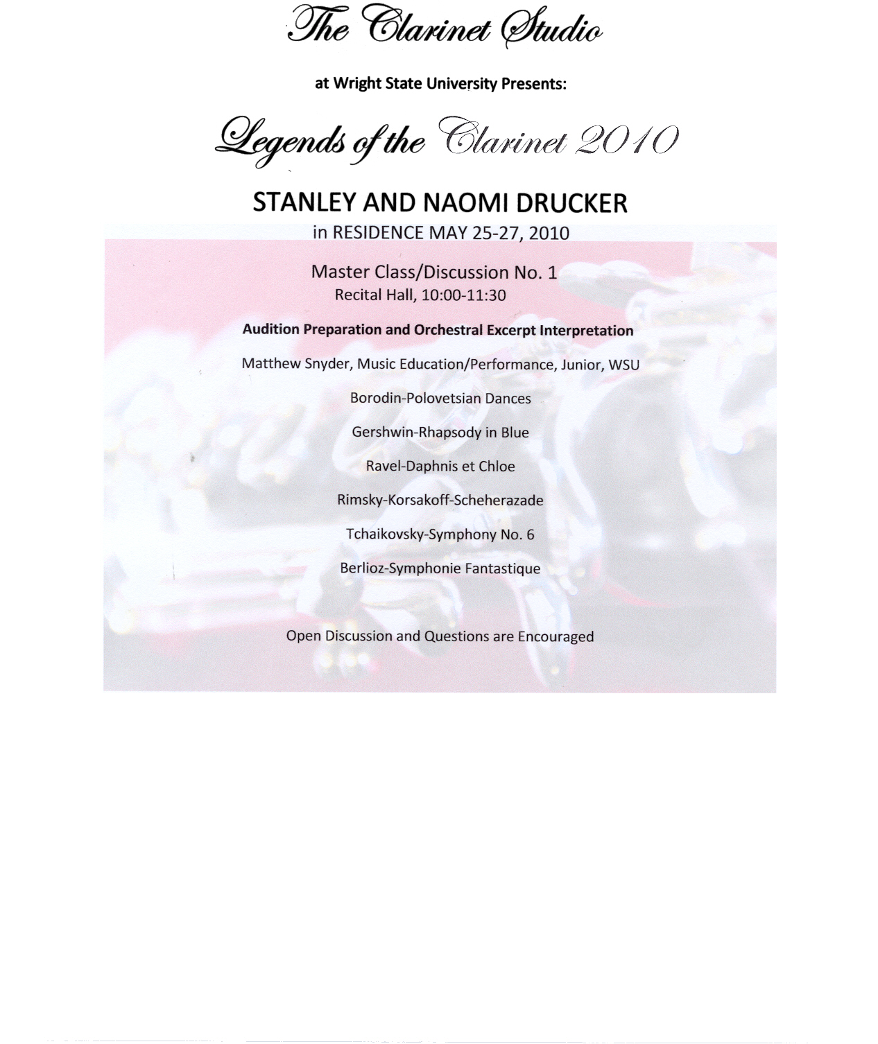 A special 3 days including collaboration with the University Department of Medicine covered separate but related areas common to both professions. Sessions were held separately by both departments with some fused together with panelists conferring together in a session about health and injury issues facing performing musicians. Dr Stanley Drucker and his wife Naomi took a major role in Master Classes and a major finale concert including recital and performance of the Weber 2nd Clarinet Concerto for a full house at the Schuster Concert Hall in the Creative Arts Center on campus. Director of this Symposium was Clarinet Professor Dr Randall Paul and his wife Nora Paul, a former student of Naomi Drucker from years past. This made this appearance special for all involved. Programs of all the Classes and concerts galleried throughout this summary.